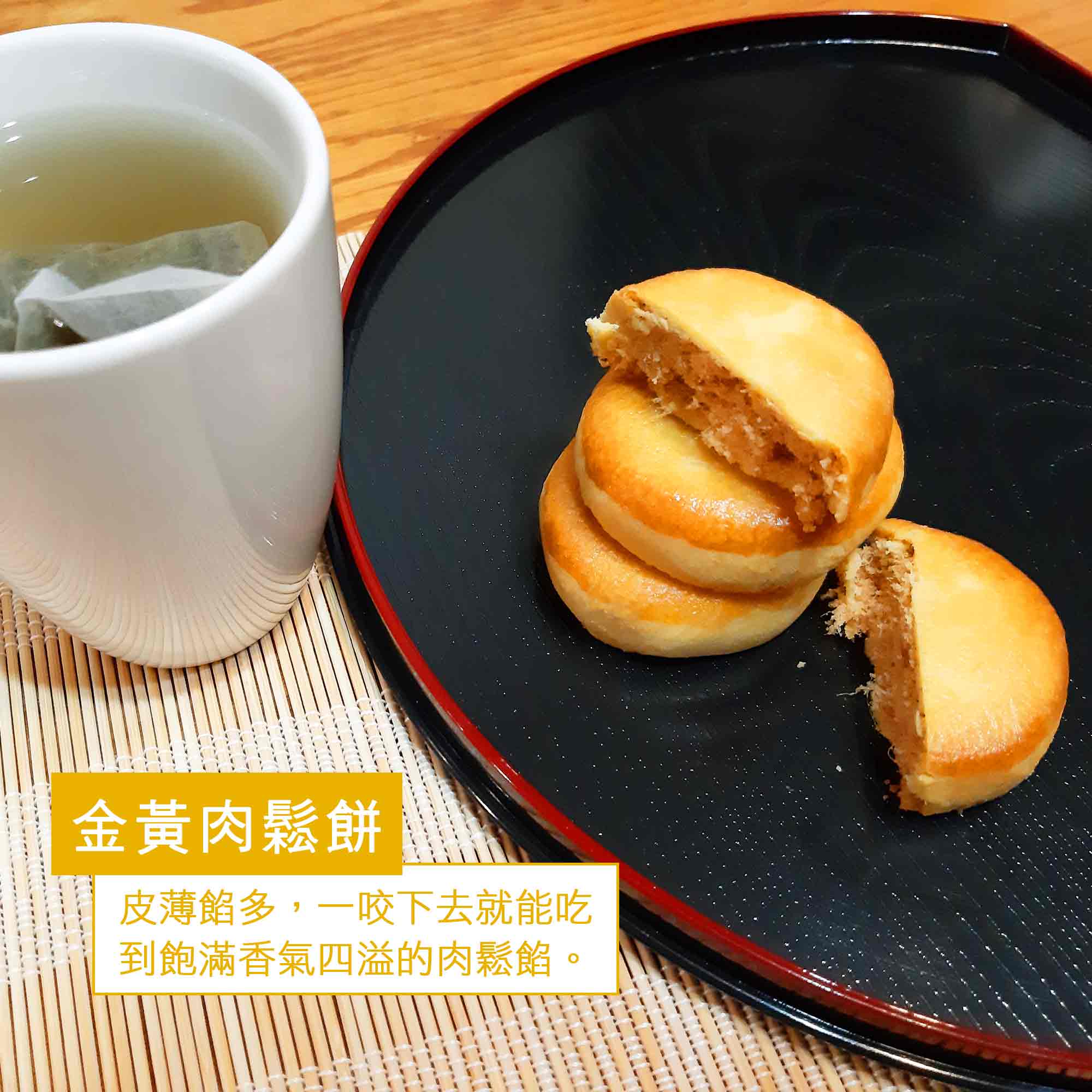 如果不喜歡太甜的下午茶點心,肉鬆餅也是很好的選擇。濃農本家的肉鬆餅外層餅皮酥香,內餡則是鹹香肉鬆,吃起來鹹甜平衡。許多不愛甜食的人會特別喜歡這種口味。